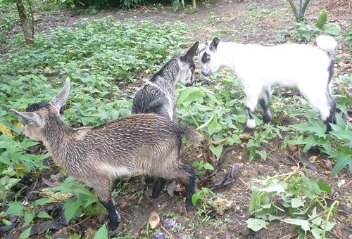 お隣ユキちゃんが1か月前に生んだ双子のきんちゃん・ぎんちゃんと、生後2週間のうちのシゲちゃん(右の白いの)。同じ柄で色違い。 この画像は大雨に濡れた後なので体色が分かりづらいが、金・銀・パール(昔、洗剤でそういうのがあった)の3姉妹。この3匹は…