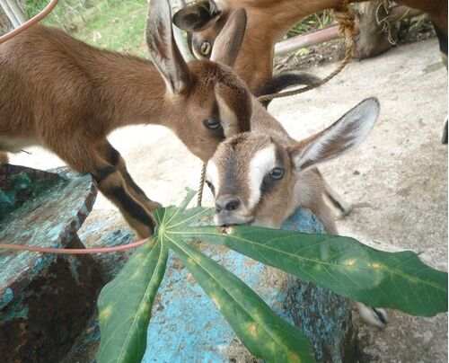 子ヤギたちは母ヤギが食べているそばで、その葉っぱや草を匂って、自然に食べられるものを見分けていく。サブ子は鼻を膨らましながらキャッサバの葉っぱを匂ってかじってみている。まだ食べることはしないがクンクン匂って、ハムハム噛んでみる。 生後まだ4…