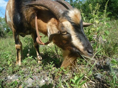 朝から空が一面むらなく曇っていた。昼から小雨がずっと降っている。暖かい小雨なのでヤギたちも気にせず食べている。夕方まで本降りにならないといけれど……。 結局夕方にだんだん薄日が差す位になってきて助かった。■夕方のオスチーム◇近所の子牛体はうちで…