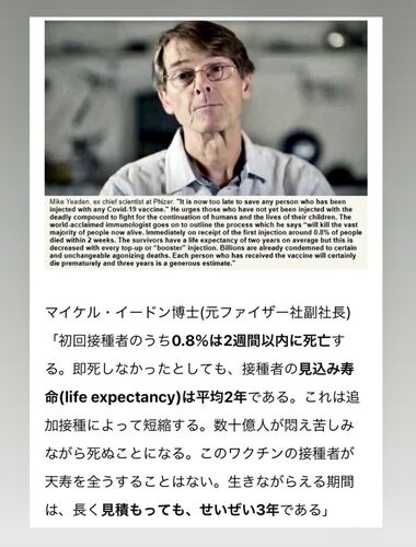■これまでに何度か短い動画をUPしましたが、またファイザーの元副社長のマイケル・イードン博士による恐ろしい翻訳コメントを貼ります。 現在のファイザー社長は、「自分は健康なのでそのワクチンを打つ必要はありませんので、遠慮いたします。必要な他の方…