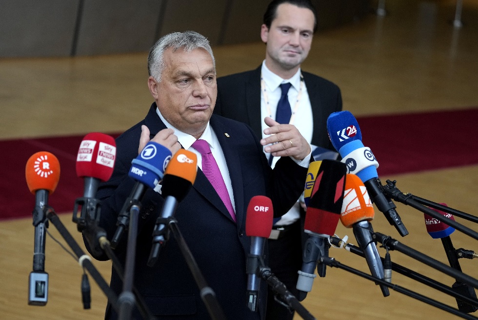 2023年10月26日木曜日、ブリュッセルの欧州理事会ビルで開催されるEU首脳会議に出席するハンガリーのオルバン首相。(AP Photo/Virginia Mayo)