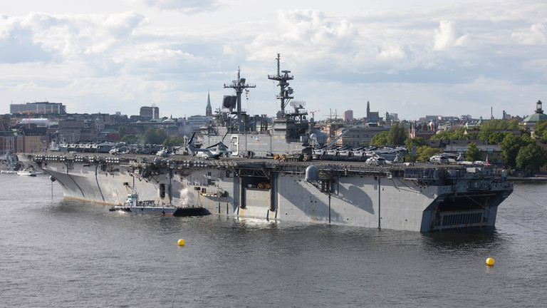 バルトップス22」演習に先立ち、スウェーデンのストックホルム港に停泊するワスプ級強襲揚陸艦「ケープ・アーガル」。 © Getty Images / Reinaldo Ubilla